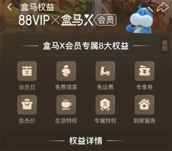 对淘宝88VIP而言,能够体验盒马X会员的免运费、会员日88折、每日领取免费菜等福利。
