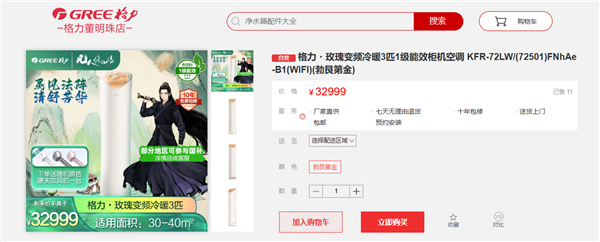 格力董明珠店显示,玫瑰变频冷暖3匹1级能效柜机空调售价32999元,独创仿生玫瑰外观造型,3D立体油墨丝印。