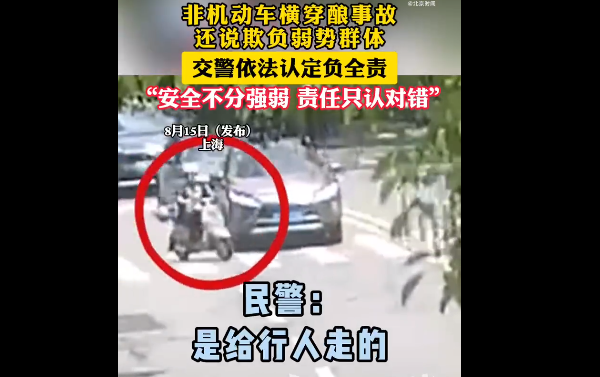 8月15日消息,据国内媒体报道称,近日,上海一女子骑电动车横穿马路酿成事故还称交警欺负弱势群体。