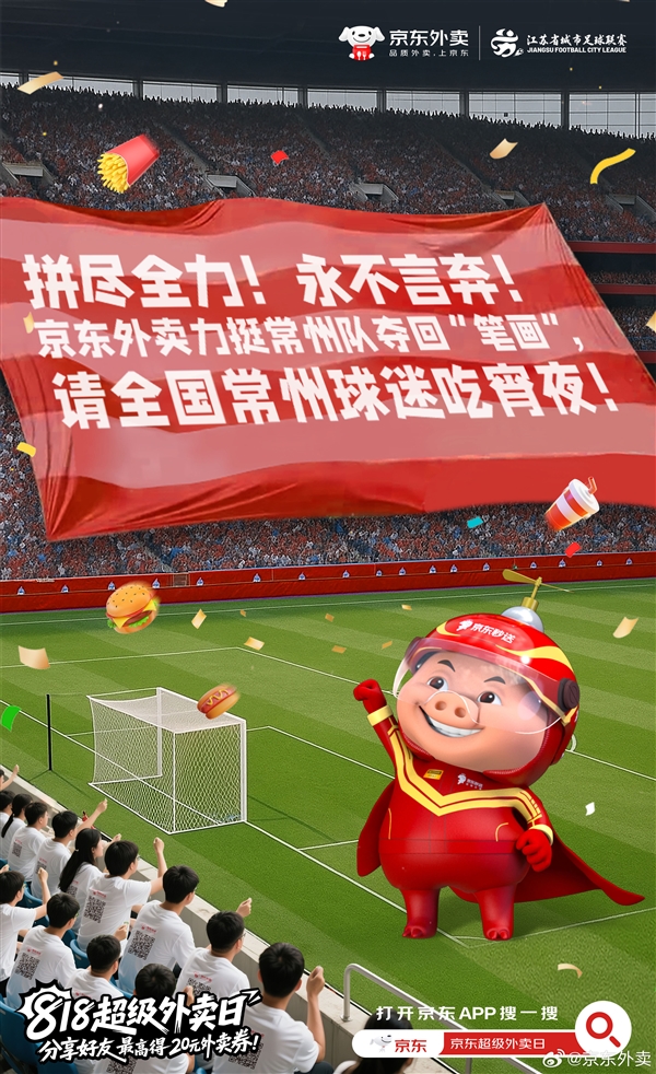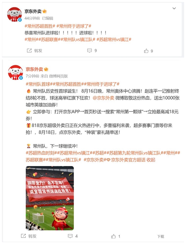 作为赞助商,京东外卖官微发文祝贺:常州队历史性首球诞生,赵连平一记推射终结8轮不胜,京东外卖致敬这份热血,送出10000张城市英雄加油券。