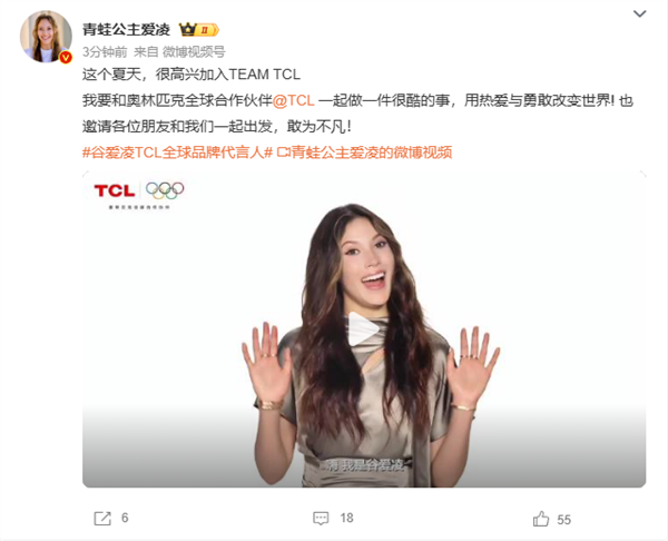谷爱凌也发文称:“这个夏天,很高兴加入TEAM TCL,我要和奥林匹克全球合作伙伴@TCL 一起做一件很酷的事,用热爱与勇敢改变世界! ”