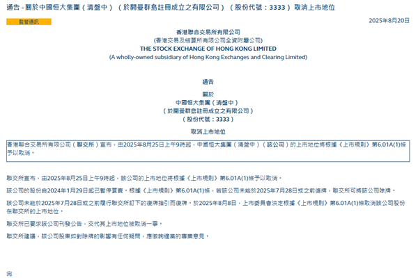 8月20日消息,今日,港交所发布公告宣布,由2025年8月25日上午9时起,中国恒大的上市地位将根据《上市规则》第6.01A(1)条予以取消。