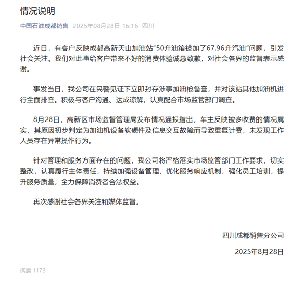 随后,中石油四川成都销售分公司也发布情况说明:近日,有客户反映成都高新天山加油站“50升油箱被加了67.96升汽油”问题,引发社会关注。
