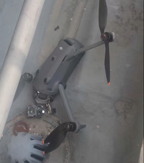 其中一架无人机坠落后,坠落后导致大厦防水层被砸出坑洞,相关无人机已交由警方处理。