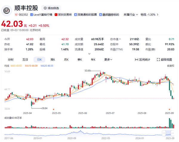 此前,自8月29日以来,顺丰控股股价持续下滑,截至9月2日,已累计下跌13.60%。