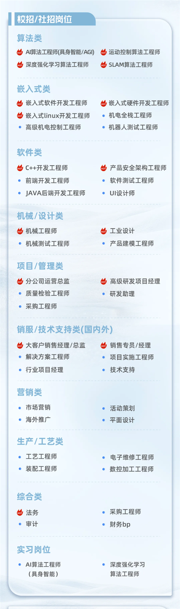 本次招聘涵盖算法、嵌入式开发、软件工程、机械/设计、项目管理、销售与技术支持等多个类别的数十个岗位。宇树科技同时表示,除上述职位外,也欢迎其他各类优秀人才积极投递。