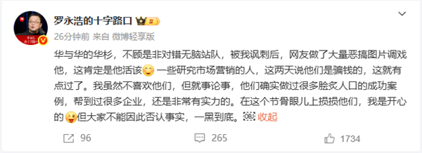 罗永浩表示:“华与华的华杉,不顾是非对错无脑站队,被我讽刺后,网友做了大量恶搞图片调戏他,这肯定是他活该。但一些研究市场营销的人,这两天说他们是骗钱的,这就有点过了。”