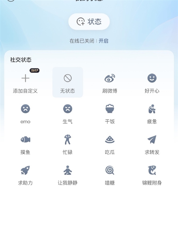 据官方介绍,社交状态是一个通过“图标 +文字”的形式,让用户表达自己当前心境和情绪的功能,除此之外还可以选择开启或关闭自己的在线状态。