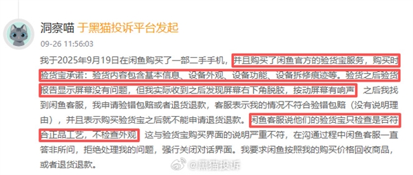 9月26日消息,近日,有消费者向黑猫投诉反馈,在闲鱼购买二手手机,用了“验货宝”后收货仍有一堆问题。