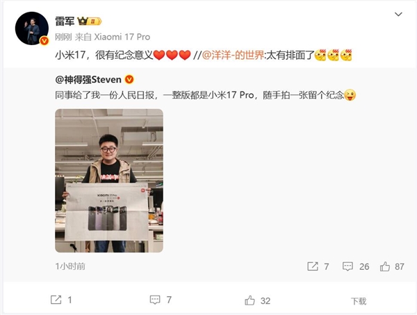 9月29日消息,小米公司新媒体总监神得强Steven晒出了一份《人民日报》,这张报纸的一整版都是小米17 Pro。小米创办人雷军转发微博并表示,很有纪念意义。